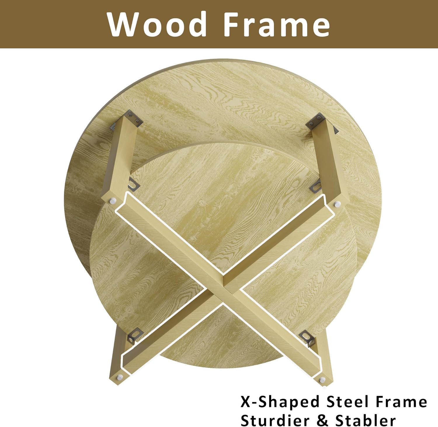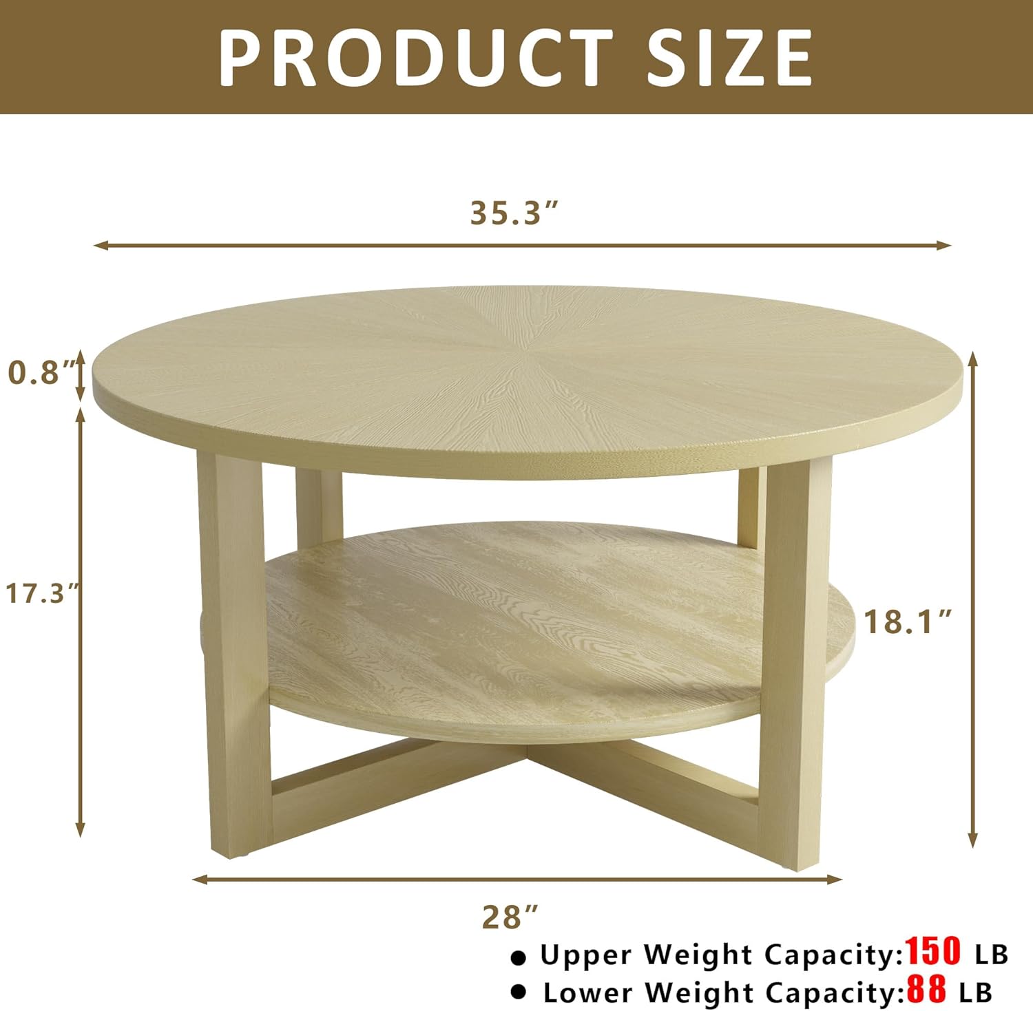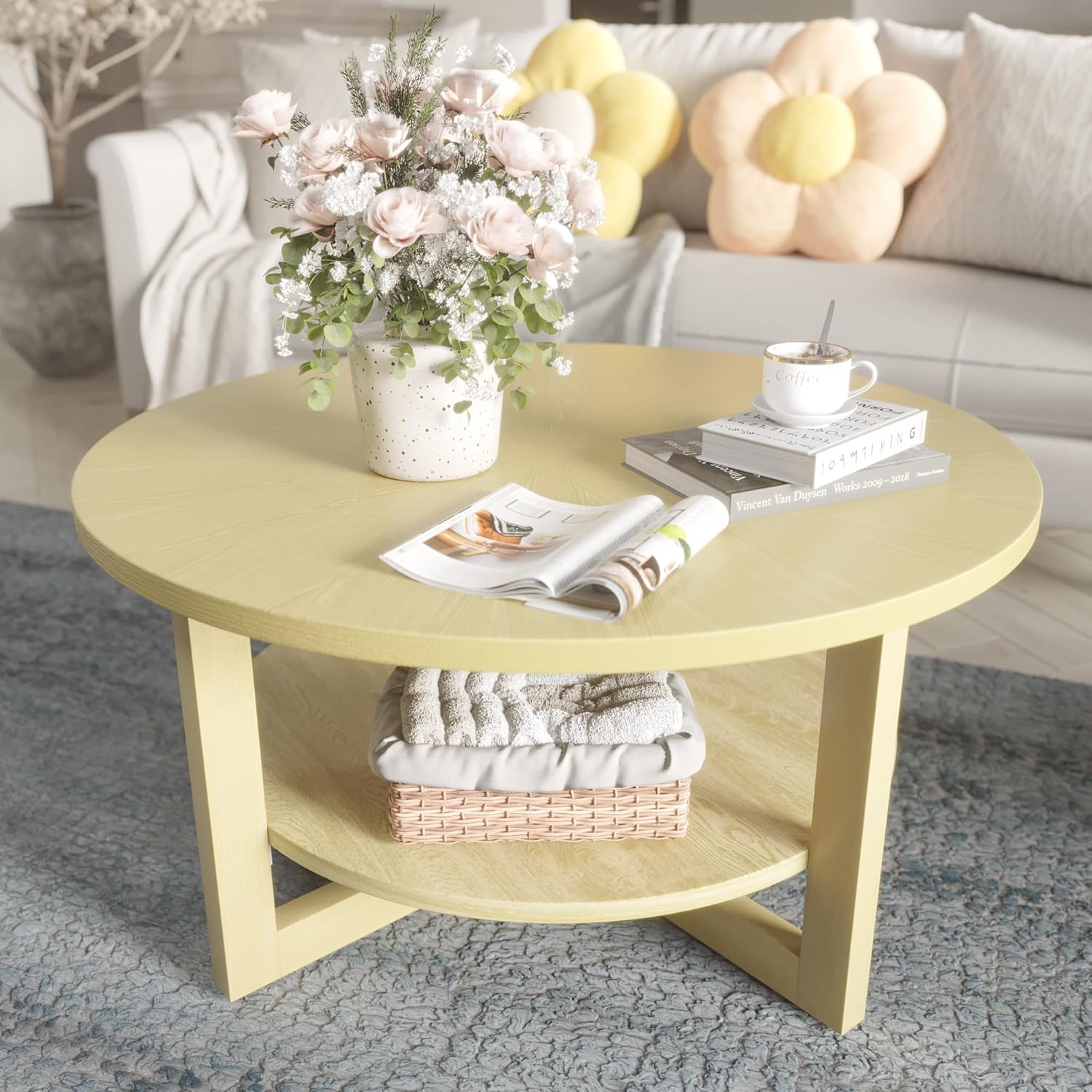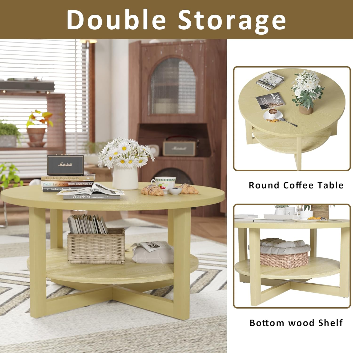 Round Coffee Table, 2-Tier Farmhouse Wooden Coffee Table with Storage Shelf, Circular Rustic Coffee Table for Living Room, Balcony and Office (Yellow)