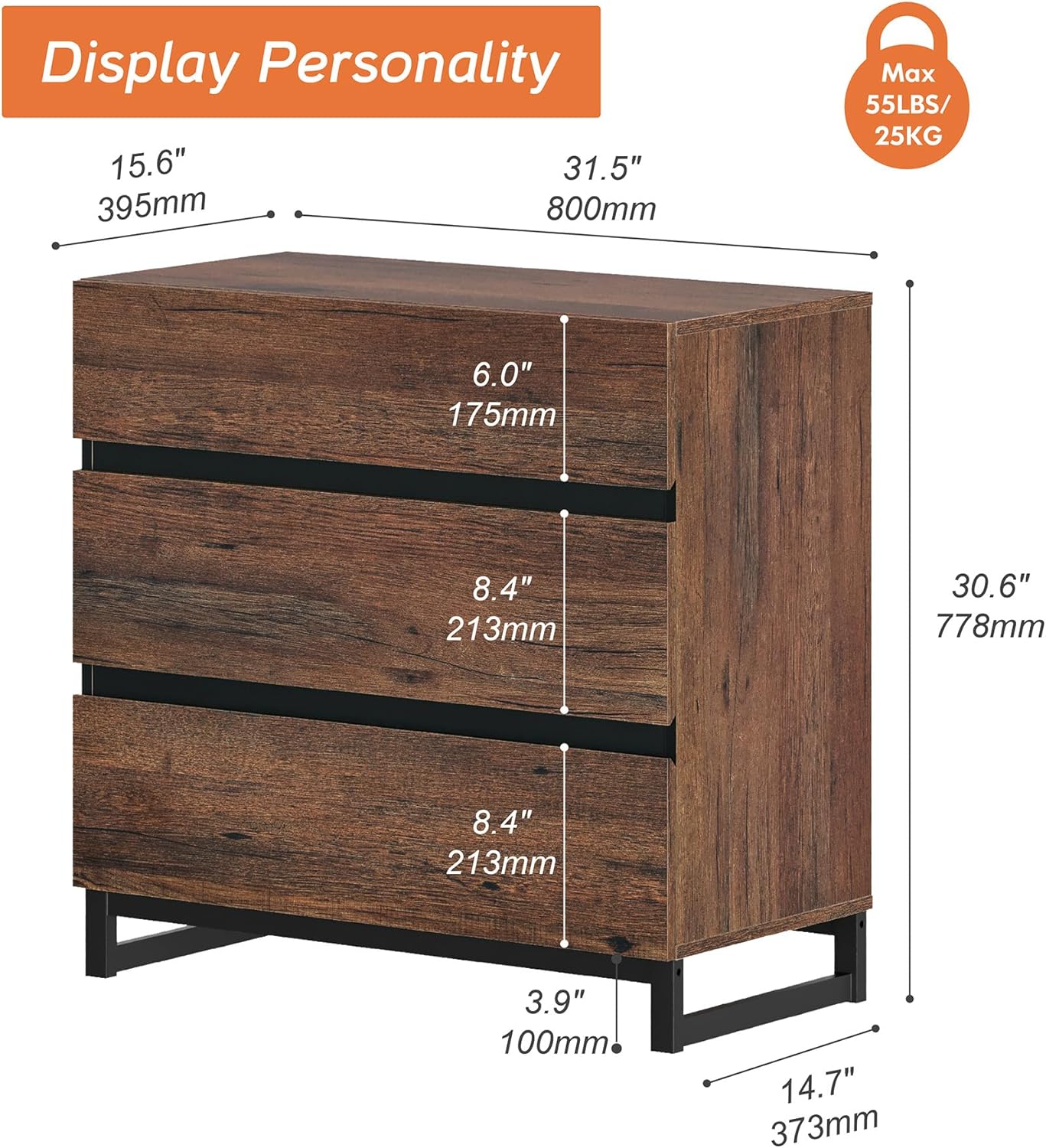 WAMPAT Nightstand with 3 Drawers for Bedroom, Modern Bedside Table with Black Square Iron Leg, Wood Rustic Side End Table for Bedroom, Brown